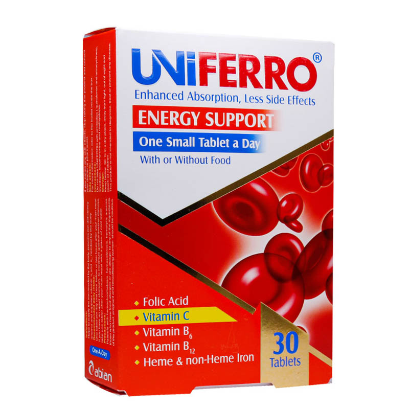 قرص یونی فرو ابیان دارو دارای فرمولاسیون منحصر به فرد و دارای ترکیبی از آهن، ویتامین ث، ب ۱۲ و ب ۶ است. یونی فرو نسل جدیدی از مکملهای حاوی آهن هم و غیر هم دارد. حضور آهن هم و غیر هم در کنار یکدیگر اثرات مناسبی داشته و حداقل عوارض گوارشی را ایجاد میکند. مکانیسم جذب این دو آهن با هم متفاوت است؛ در نتیجه بیشترین میزان جذب را در پی دارد. این مکمل جهت کمک به بهبود و جلوگیری از کم خونی ناشی از فقر آهن به کار میرود. حضور فاکتورهای مهم ویتامین C، فولیک اسید و ویتامین B۱۲، سبب افزایش جذب آهن میشود. شایع ترین علائم ناشی از کم خونی فقر آهن شامل احساس سستی، خستگی، سرگیجه، ابتلای مکرر به بیماریهای ویروسی مانند آنفلونزا، ناخنهای قاشقی شکل، خواب رفتن و گز گزدست و پاها و… است.