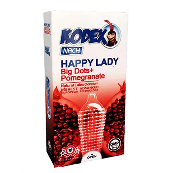 کاندوم خاردار کدکس مدل هپی لیدی با داشتن عصاره انار باعث تنگ شدن واژن خانمها شده تا آماده یک دخول هیچان انگیز باشند. از طرف دیگر وجود خارهای بسیار درشت در سرتاسر دیواره این کاندوم، هنگام دخول، برای خانمها بیشترین شادی و اورگاسمی بینظیر را به همراه خواهد داشت. جنس لاتکس کاندوم Happy Lady بسیار نازک و در عین حال مقاوم است. به همین خاطر آقایان میتوانند کاملا گرمای درون واژن را احساس کنند و به خاطر تنگ شدن آن، لذتی مضاعف را از رابطه شان ببرند. علاوه بر آن در این کاندوم از لوبریکانت مخصوصی استفاده شده تا دخول در واژن به آسانی انجام شود. کاندوم هپی لیدی ناچ کدکس در بسته ده عددی به بازار ارائه شده است.