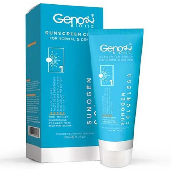 کرم ضد آفتاب سانوژن بی رنگ ژنوبایوتیک SPF50 مناسب پوست خشک و معمولی